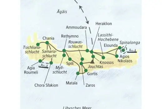 Mal wandern wir auf Eselspfaden durch die Lassithi-Hochebene, mal durch fruchtbare Täler – hier umgeben von steilen Felswänden, dort umgarnt von blühendem Oleander, duftenden Wildkräutern und knorrigen Olivenbäumen. Für die Durchquerungen der Rouwas- und der Samariaschlucht, Höhepunkte für jeden Wanderer, sollten Sie ein bisschen Kondition mitbringen, die anderen Wanderungen stellen eher mittlere Anforderungen. Für Strand- und Cafépausen ist zwischendurch immer wieder gesorgt. Der Palast von Knossos inspiriert mit Geschichte und Geschichten, und wie Kreta schmeckt, erfahren Sie beim Besuch einer Olivenpresse oder bei Käsehappen bei einem Schäfer. Eine perfekte Reise für alle, die Kreta mit jeder Facette und aktiv erkunden wollen.