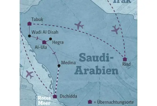 Entdecken Sie Saudi-Arabien zwischen Tradition und Moderne: von der pulsierenden Metropole Riad über die spektakuläre Kulturlandschaft Al-Ula bis zur historischen Hafenstadt Dschidda. Erleben Sie jahrtausendealte Geschichte, beeindruckende UNESCO-Stätten, faszinierende Wüstenlandschaften und herzliche Gastfreundschaft — das perfekte Abenteuer für Kultur- und Entdeckerfreunde.
