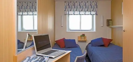 2-Bett-Außenkabine Standard 13 Kabinen mit 2 unteren Einzelbetten (jeweils 81 cm breit). Alleinnutzung gegen Aufpreis buchbar.